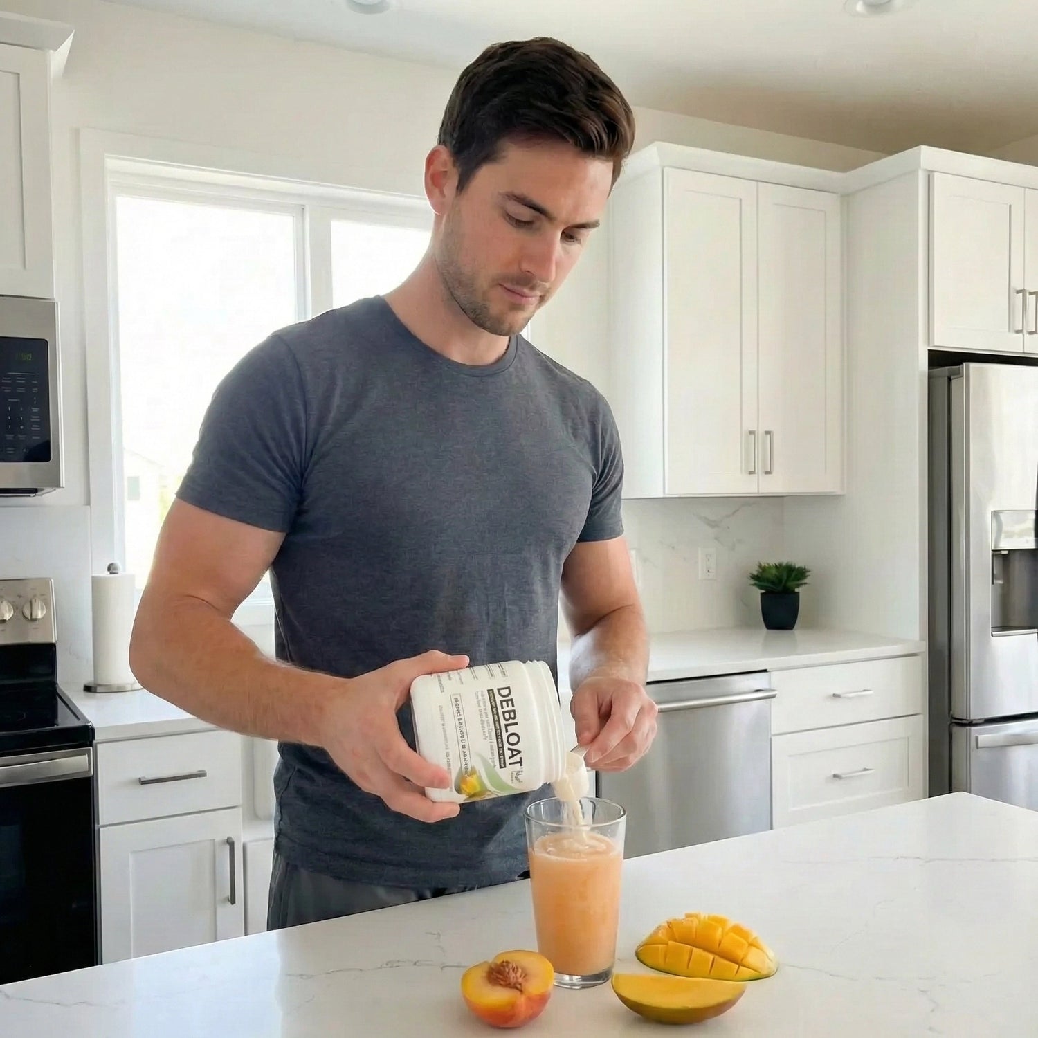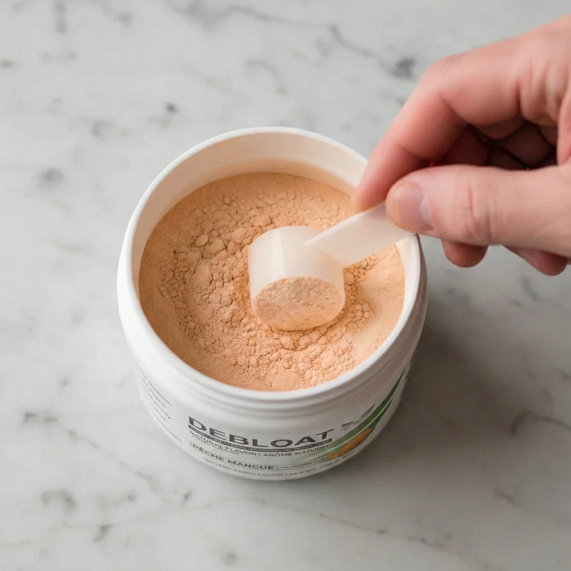 DeBloat a un goût pêche–mangue rafraîchissant, agréable avec de l’eau ou votre boisson préférée. La plupart des clients disent que ça ressemble à un jus de fruits léger et que c’est facile à boire chaque jour. Le mélange est bien homogène, sans texture granuleuse.