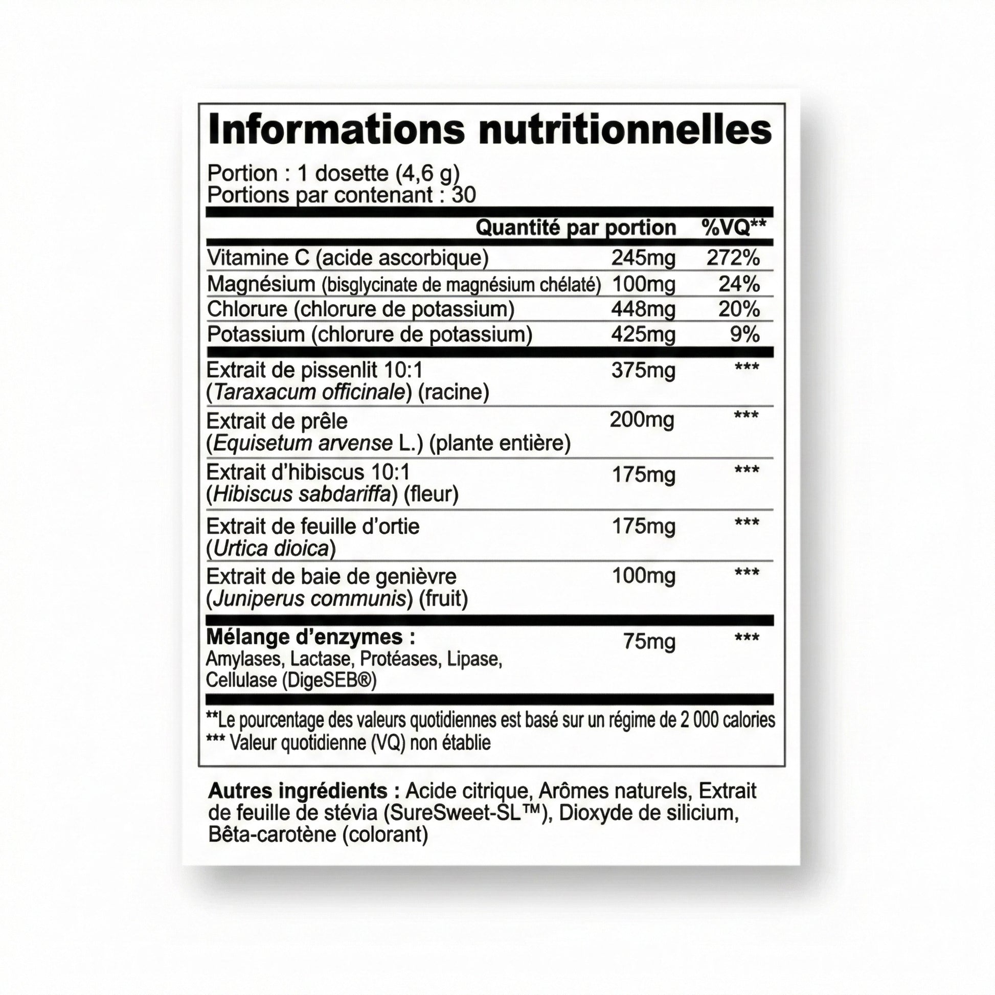 - Botaniques naturelles : comme racine de pissenlit, hibiscus & autres plantes qui favorisent une élimination fluide et naturelle.